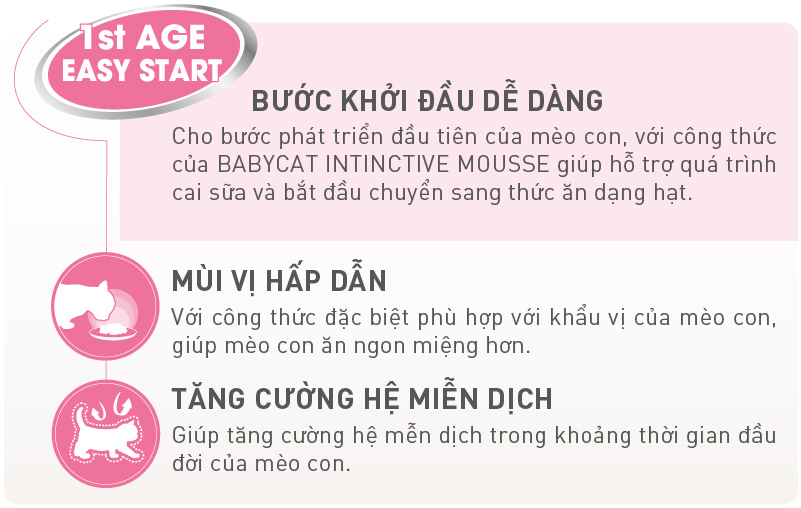 • Đối với mèo con, kết cấu mousse của MOTHER & BABYCAT giúp hỗ trợ quá trình chuyển tiếp sang thức ăn hạt khô.