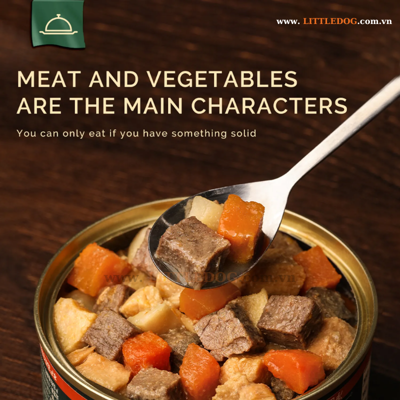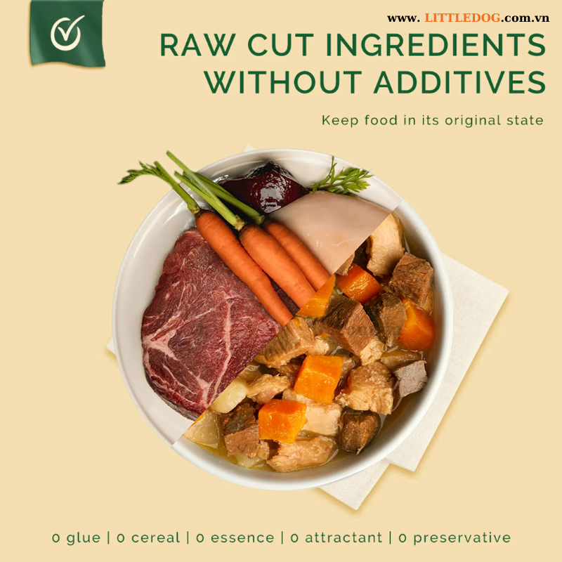 - Thành phần: 33% thịt bò, 30% ức gà, 21% gan bò, 8% cà rốt, 8% khoai mỡ.