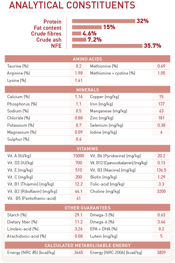 Protein gia cầm, gạo, lúa mì, bắp, chất béo động vật, protein thịt heo*, xơ thực vật, bột lúa mì, protein động vật, gluten bắp, men, củ cải đường, dầu đậu nành, dầu cá, khoáng chất, psyllium, men thủy phân (nguồn manno-oligo-sacarit), chiết xuất cúc vạn thọ (nguồn lutein).