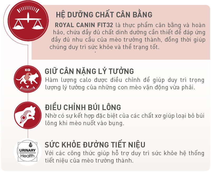 Thức ăn cho mèo ROYAL CANIN FIT32 hỗ trợ sức khỏe của mèo bằng cách cung cấp các chất dinh dưỡng chính xác giúp hệ dưỡng chất cân bằng, giữ cân nặng lý tưởng và điều chỉnh búi lông dựa trên nghiên cứu của các nhà khoa học ROYAL CANIN.
