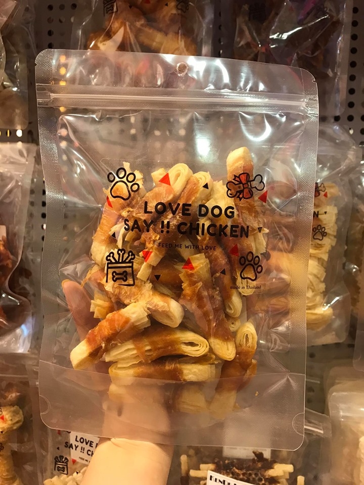 Sản phẩm gà xấy LoveDog Thái Lan với thành phần gà sấy và cá sợi.