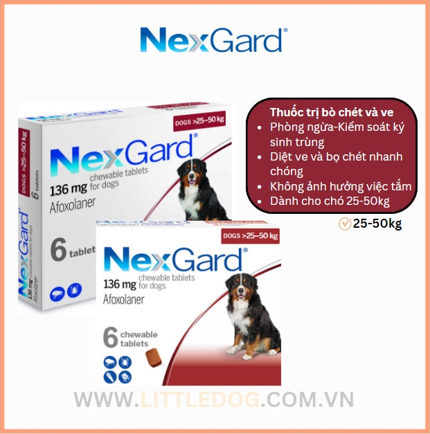 • Cách dùng: Viên NexGard là viên nhai và ngon miệng với hầu hết các giống chó. Nếu chó không dùng trực tiếp thì có thể trộn vào thức ăn.