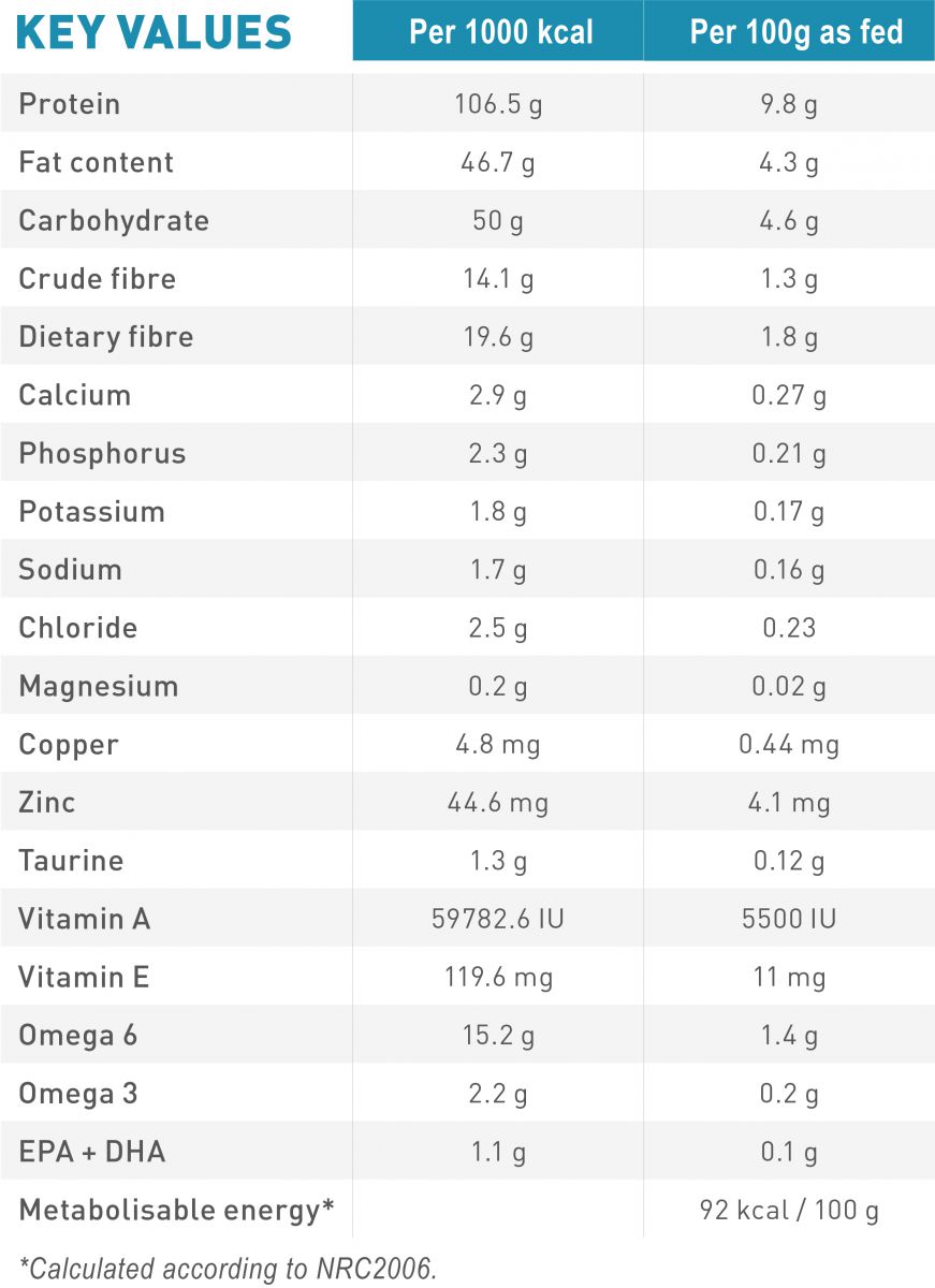 Bắp, bột protein gia cầm, gluten lúa mì*, gạo, gluten bắp, protein động vật thủy phân, chất béo động vật, chất xơ thực vật, củ cải đường, khoáng chất, dầu cá, vỏ và hạt psyllium, fructo-oligo-saccarit, dầu đậu nành, dầu lưu ly, chiết xuất cúc vạn thọ (nguồn lutein).