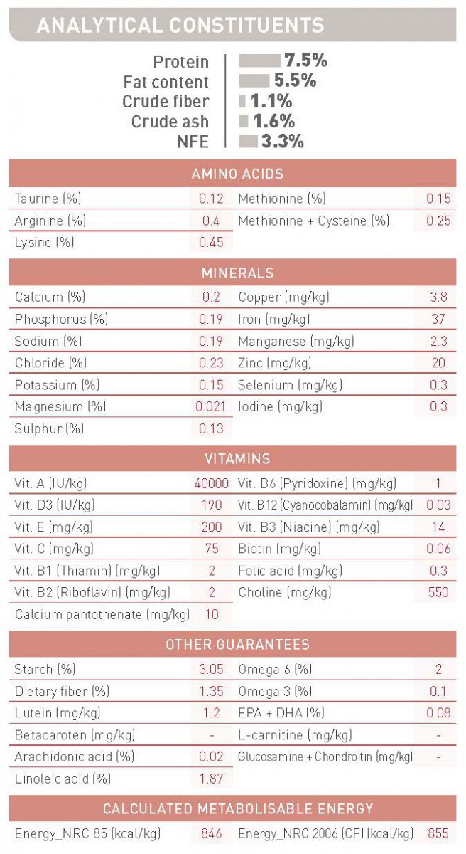 Phụ gia dinh dưỡng: Vitamin D3, E1 (Iron), E2 (Iodine), E4 (Copper), E5 (Manganese), E6 (Zinc).