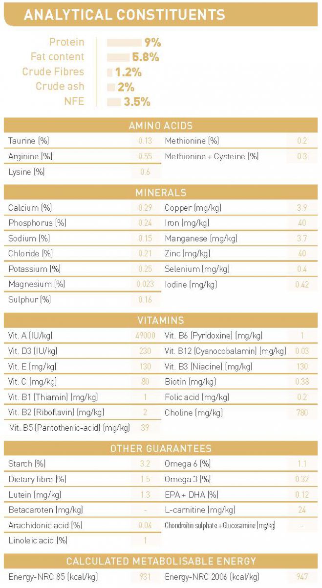 Phụ gia dinh dưỡng: Vitamin D3, E1 (Sắt), E2 (I ốt), E4 (Đồng), E5 (Mangan), E6 (Kẽm).