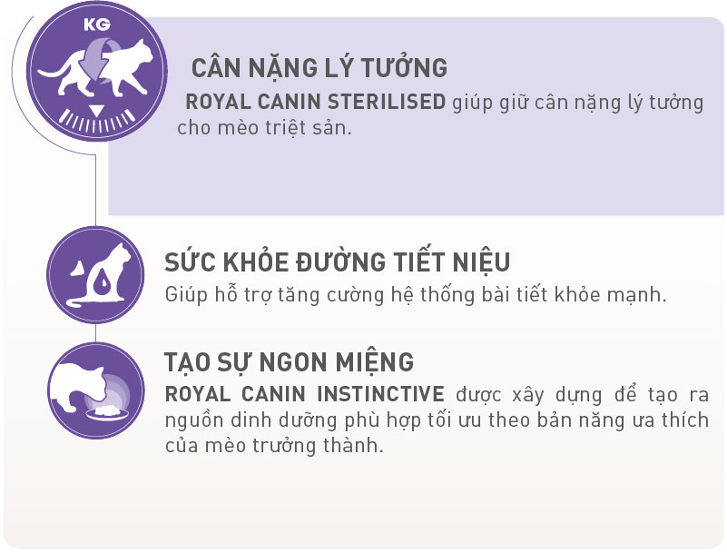 Sản phẩm ROYAL CANIN Sterilised Wet được thiết kế dựa trên nhu cầu dinh dưỡng và bản năng của mèo. Công thức của ROYAL CANIN được tạo ra với sự cân bằng tối ưu giữa protein, chất béo và carbohydrate để hỗ trợ mèo ăn ngon miệng lâu dài và bổ sung dinh dưỡng hoàn hảo cho thức ăn khô khô cao cấp của ROYAL CANIN.