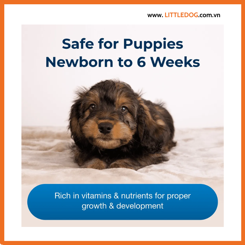 Công thức sữa bột cho chó con có bổ sung prebiotics, probiotics và vitamin, phù hợp cho chó con từ sơ sinh đến 6 tuần tuổi – dễ tiêu hóa, dễ pha, và giàu dinh dưỡng.