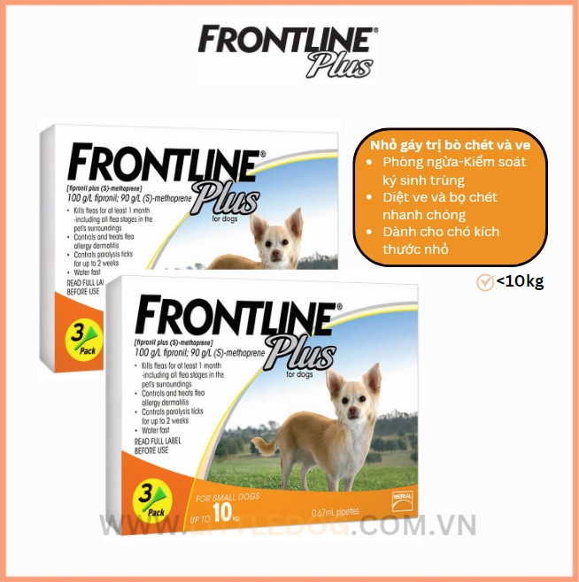 – Các nghiên cứu đã chứng minh rằng Frontline® Plus for dogs tiêu diệt được trứng, nhộng và bọ chét trưởng thành cho đến 3 tháng. Frontline® Plus for dogs tiêu diệt được ve ít nhất 1 tháng; và chỉ cần một lần sử dụng sẽ kiểm soát được ve nơi cần kiểm soát. Mặc dù Frontline® Plus có thể kiểm soát được bọ chét cho đến 3 tháng, nhưng nếu có nguy cơ tái nhiễm hay do bọ chét gây viêm da dị ứng thì có thể lặp lại mỗi tháng.