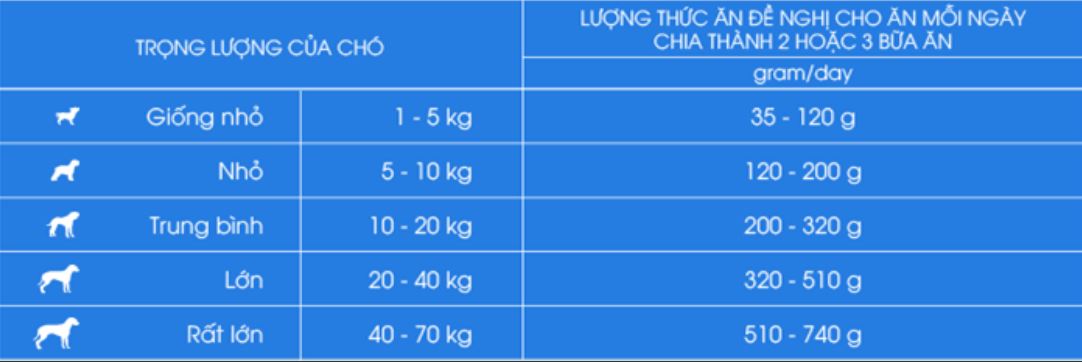 Hướng dẫn sử dụng: Cho ăn theo trọng lượng và nhu cầu của chó. Vui lòng tham khảo bảng hướng dẫn trên bao bì sản phẩm.