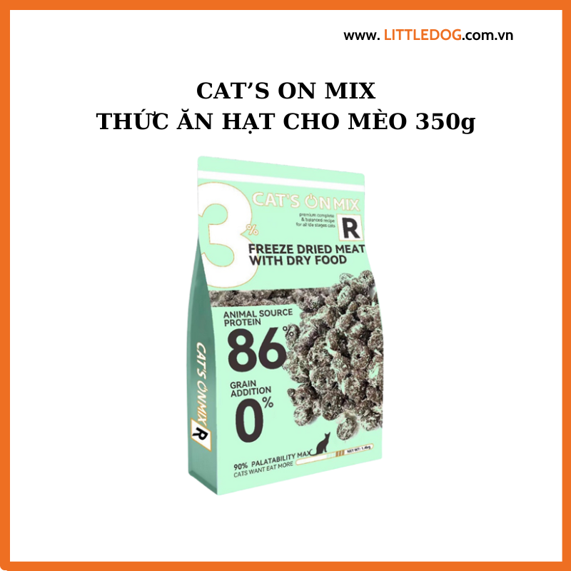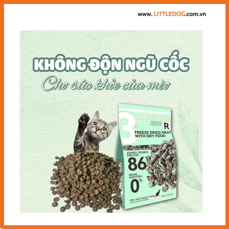 Cat’s On Mix R là dòng hạt khô cao cấp không chứa ngũ cốc, giàu protein từ thịt thật, kết hợp cùng topping thịt sấy thơm ngon giúp kích thích vị giác và tăng cảm giác thèm ăn cho mèo.