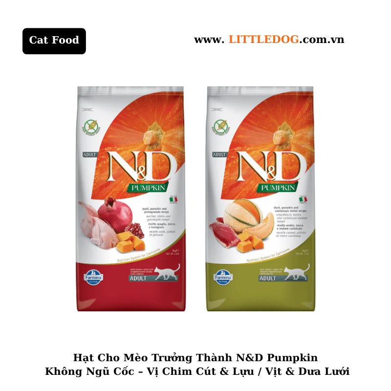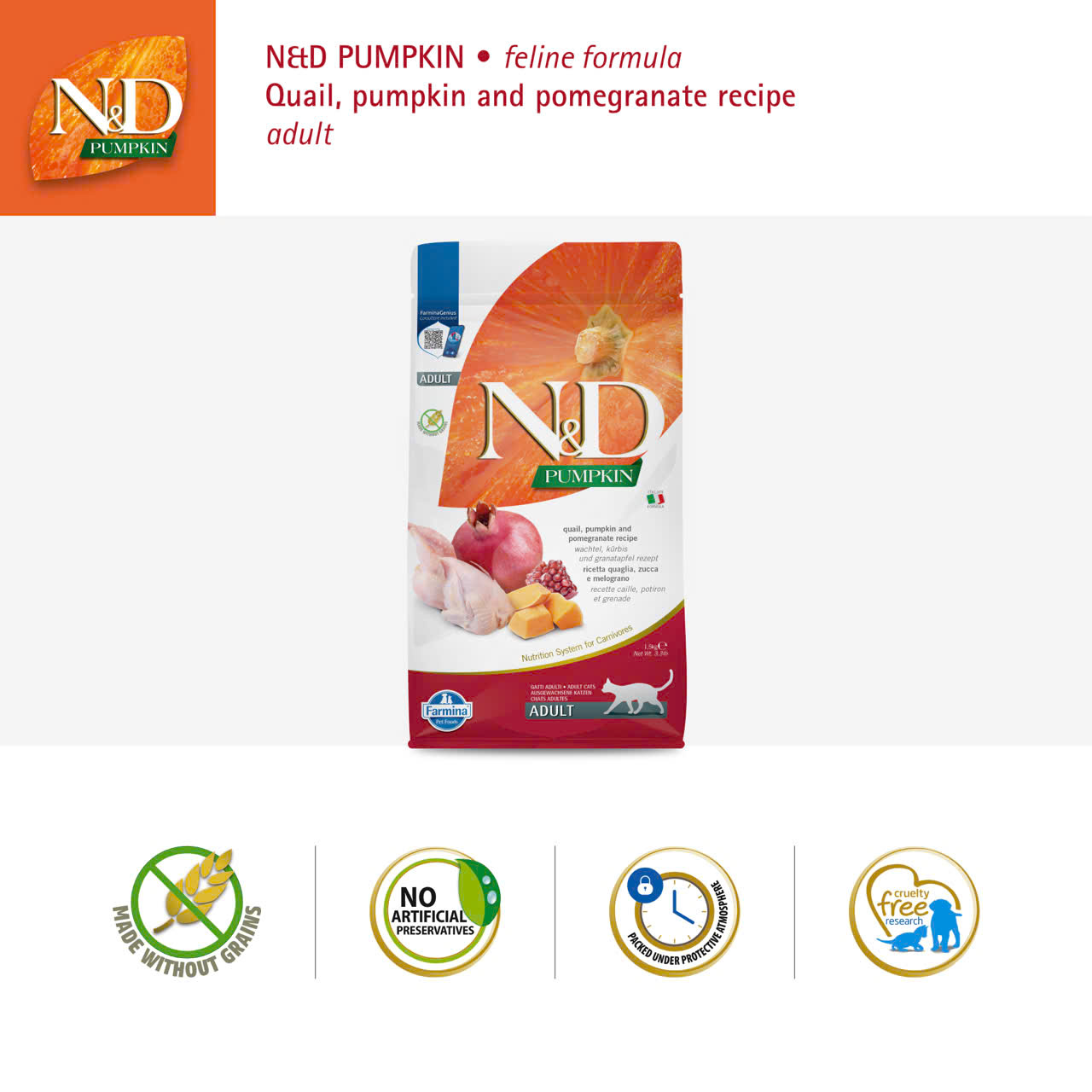 N&D Pumpkin là dòng thức ăn hạt cao cấp đến từ thương hiệu Farmina (Ý), được sản xuất bằng công nghệ hiện đại và đáp ứng các tiêu chuẩn nghiêm ngặt về an toàn, dinh dưỡng và chất lượng. Với nguyên liệu tươi sạch, công thức không chứa ngũ cốc và gluten, N&D Pumpkin là lựa chọn lý tưởng cho mèo trưởng thành từ 12 tháng tuổi trở lên.
