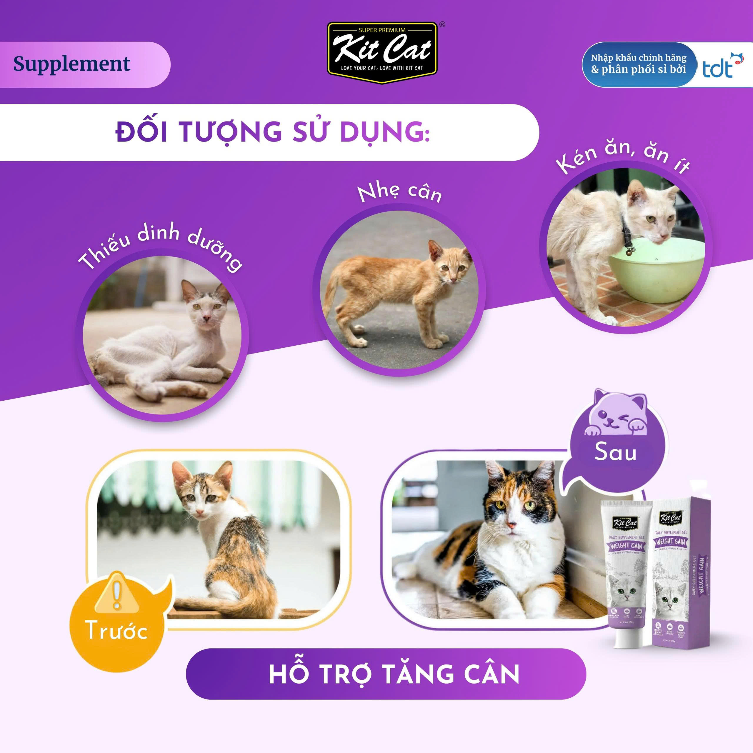 Kit Cat Daily Supplement Gel – Giải pháp bổ sung dinh dưỡng toàn diện, giúp mèo cưng tăng cân khỏe mạnh. Công thức giàu vitamin, khoáng chất và amino acid từ men bia tự nhiên kết hợp với 5 chủng lợi khuẩn và enzyme tiêu hóa, hỗ trợ hấp thu dưỡng chất tối ưu. Xơ Psyllium Husk giúp hệ tiêu hóa vận hành trơn tru, đảm bảo Boss phát triển cân đối, tràn đầy năng lượng.