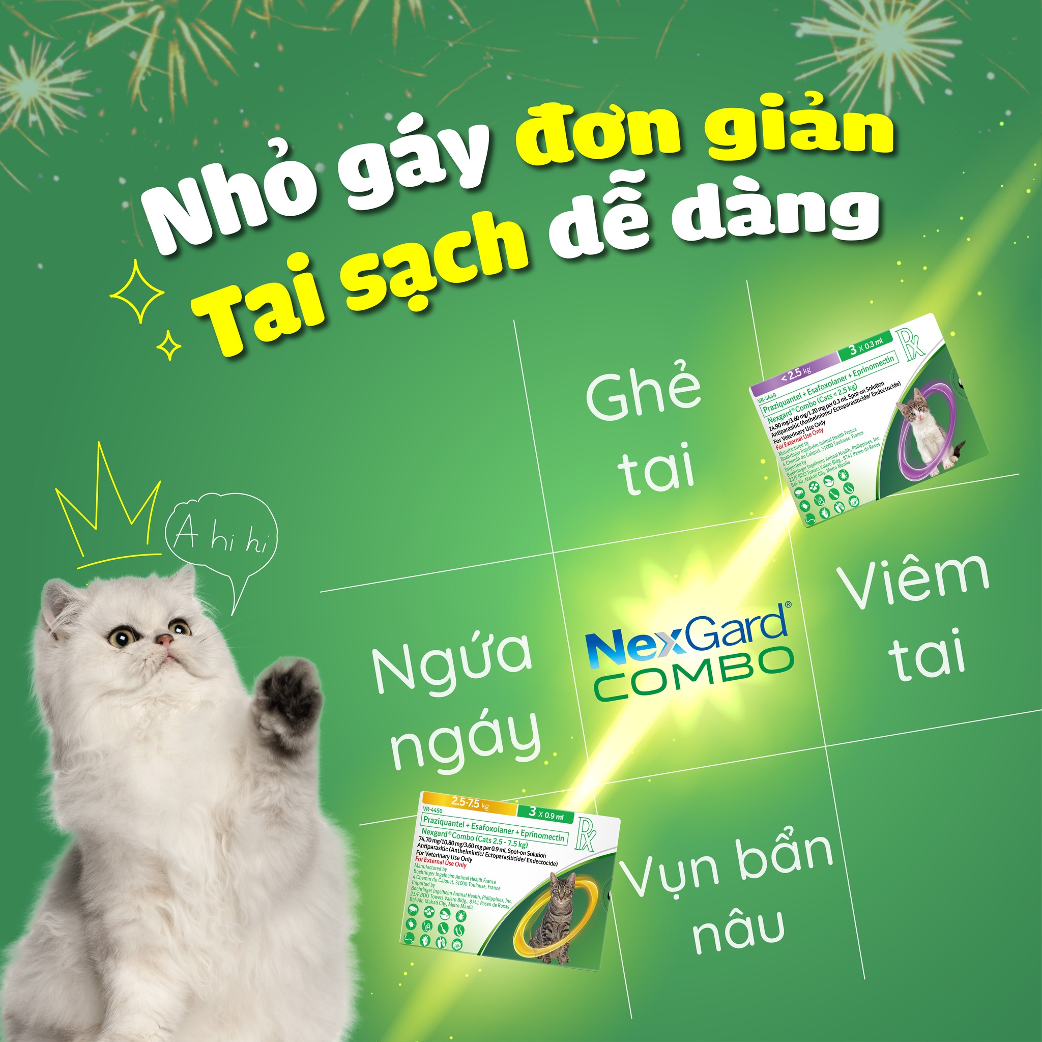 Một số người nuôi mèo có thể lầm tưởng rằng việc nhỏ NexGard COMBO® trực tiếp vào tai sẽ hiệu quả nhất. Tuy nhiên, để tối ưu hiệu quả và hấp thụ nhanh chóng, bạn nên nhỏ NexGard COMBO® vào gáy mèo (vị trí giữa hai vai) – nơi mèo không thể tự liếm, giúp sản phẩm được hấp thụ tốt và đảm bảo hiệu quả tốt nhất.