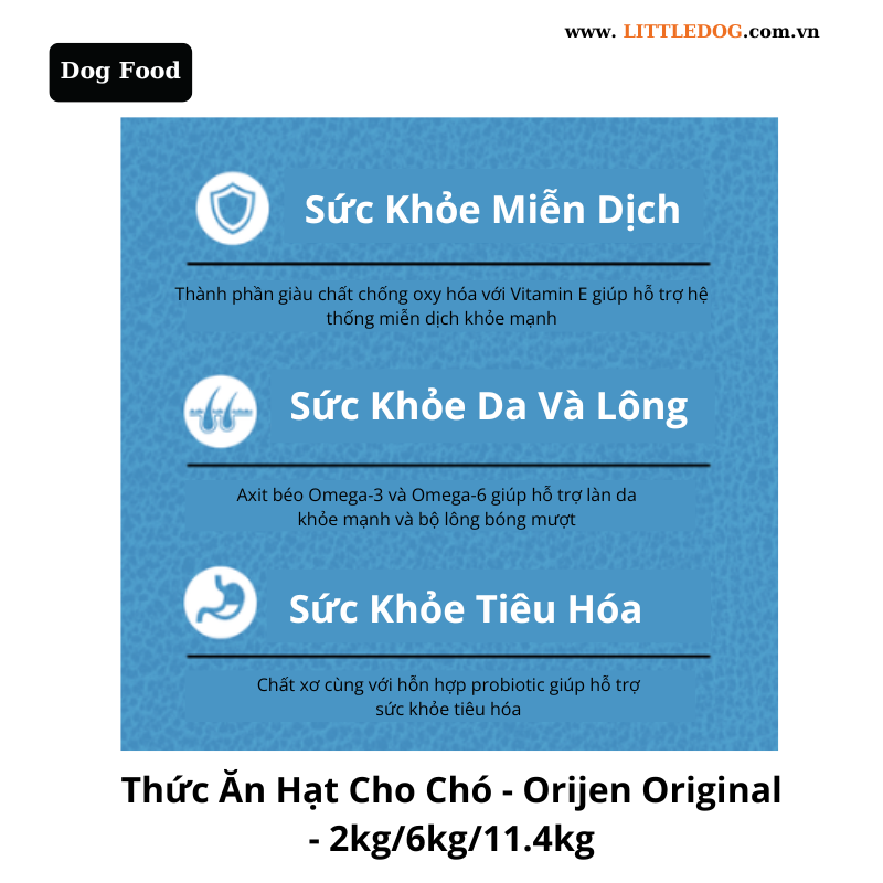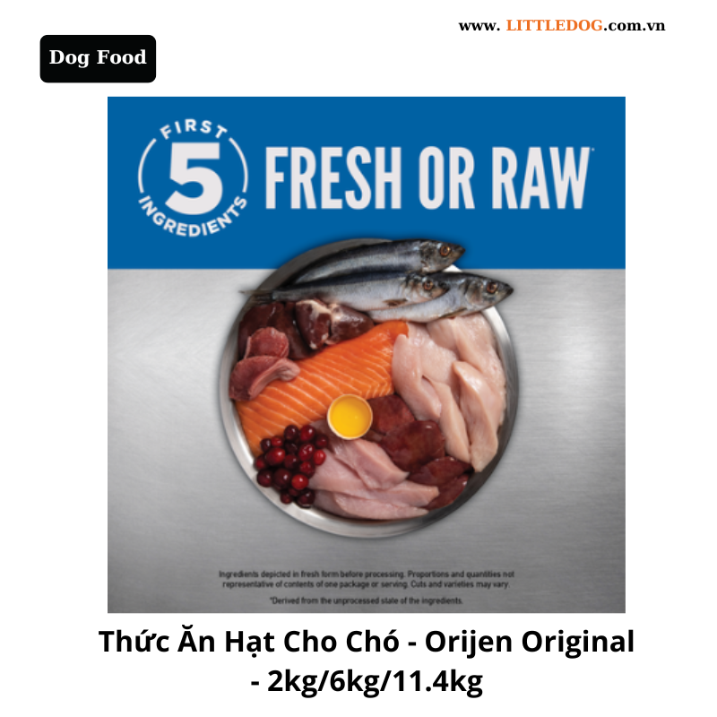 Cung cấp cho cún của bạn nguồn dinh dưỡng giàu đạm với ORIJEN Original. ORIJEN Original (không chứa ngũ cốc*) được làm từ các thành phần giàu chất chống oxy hóa và Vitamin E để giúp hỗ trợ hệ miễn dịch khỏe mạnh, đồng thời cung cấp axit béo Omega-3 và Omega-6 tự nhiên để hỗ trợ làn da khỏe mạnh và bộ lông sáng bóng. Công thức của ORIJEN Original được làm từ 85% thành phần đạm động vật như gà thả vườn, gà tây thả vườn và cá đánh bắt tự nhiên. Năm thành phần đầu tiên ORIJEN Original là thịt gà tươi hoặc sống, gà tây, cá hồi, cá trích, gan gà. Nguyên liệu tươi đi kèm của ORIJEN được tươi mỗi ngày và nguyên liệu thô đi kèm của chúng tôi được giao ở dạng đông lạnh.