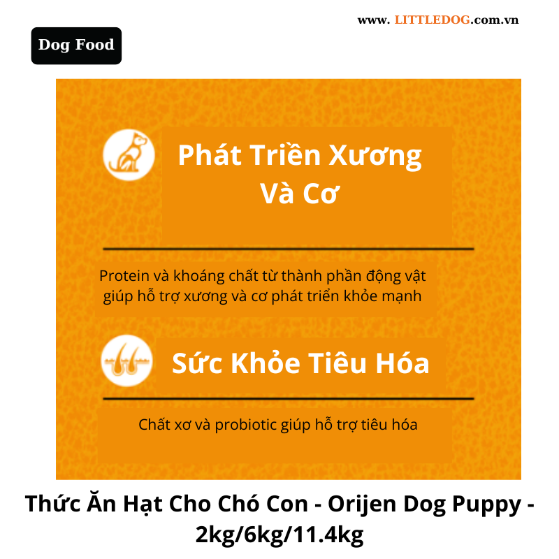 Giúp chó con của bạn phát triển khỏe mạnh với các công thức giàu protein mang lại sự nuôi dưỡng tối ưu. Tất cả chó con đều phát triển tốt nhất trên chế độ ăn uống Sinh Học Phù Hợp, được chế biến từ các thành phần động vật tươi hoặc sống giàu protein. Chế độ ăn này được thiết kế đặc biệt để hỗ trợ sự phát triển và phát triển trí não của chó con. ORIJEN Puppy được chế biến với 85%* thành phần động vật chất lượng như gà và gà tây thả rông** tươi hoặc sống, cùng với cá tự nhiên. Được đóng gói với các thành phần động vật từ WholePrey như nội tạng, thức ăn ORIJEN được làm từ những phần dinh dưỡng nhất và tươi ngon nhất của con mồi, cung cấp dinh dưỡng mà chó con cần. Các thành phần động vật giàu dinh dưỡng trong chế độ ăn này giúp hỗ trợ sự phát triển trí não, cơ bắp & xương, và sức khỏe tiêu hóa của chó con. Kết quả là một chế độ ăn vượt trội dành cho người bạn bốn chân của bạn.