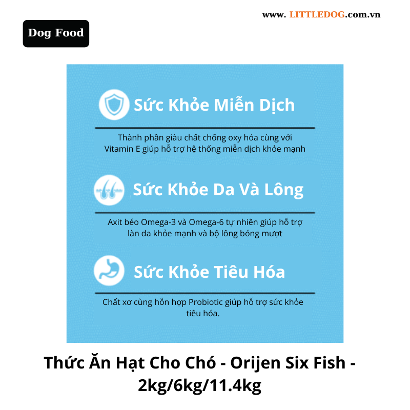 Giúp chó của bạn phát triển mạnh mẽ với các công thức giàu protein cung cấp dinh dưỡng tối ưu. Chó là loài ăn thịt từ tổ tiên, vì vậy chúng cần một chế độ ăn phù hợp với sinh học, được làm từ các nguyên liệu động vật tươi hoặc sống. Công thức ORIJEN Six Fish được chế biến từ nhiều loại cá tươi ngon, bao gồm cá trích nguyên con, cá hồi, cá monkfish, cá đỏ Acadian, cá bơn và cá hake nguyên con. Được bổ sung các thành phần động vật giàu dưỡng chất như nội tạng và xương, thức ăn của ORIJEN được làm từ các phần giàu dinh dưỡng nhất và ngon nhất của con mồi, mang đến dưỡng chất mà chó cần. Với 85%* nguyên liệu cá chất lượng cao và lớp phủ đông khô, chế độ ăn này thực sự vượt trội. Các thành phần động vật giàu dưỡng chất trong công thức ORIJEN Six Fish giúp hỗ trợ sức khỏe hệ miễn dịch, da và lông, cũng như tiêu hóa cho chó.