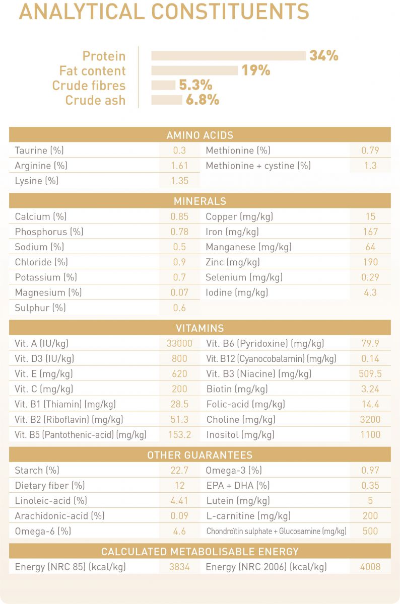 Protein gia cầm, gạo, protein thực vật*, chất béo động vật, bắp, gluten bắp, xơ thực vật, protein động vật, rau diếp xoăn, dầu cá, dầu đậu nành, khoáng chất, men, fructo-oligo-sacarit, men thủy phân (nguồn manno-oligo-sacarit), dầu borage, giáp xác thủy phân (nguồn glucosamine), chiết xuất cúc vạn thọ (nguồn lutein), sụn thủy phân (nguồn chondroitin).