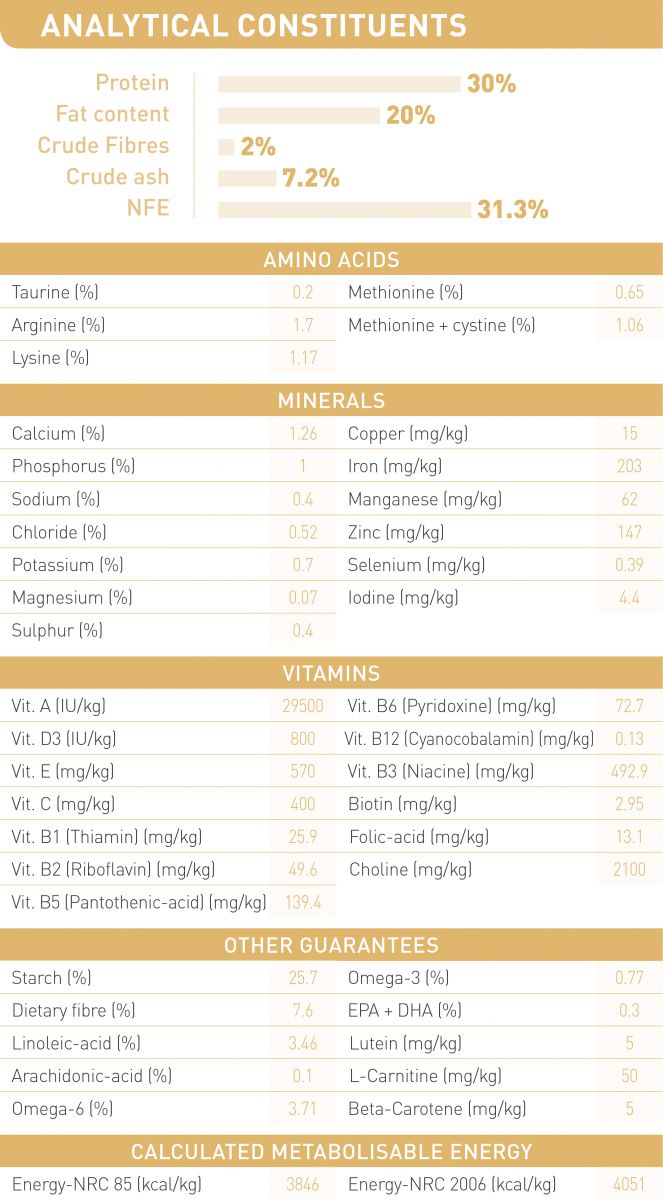 Protein gia cầm khô, lúa mạch, chất béo gà, ngô, lúa mì gluten, bột củ cải đường khô khô, hương vị tự nhiên, yến mạch yến mạch, dầu cá, dầu thực vật, natri silic aluminat, monocalcium phosphate, canxi cacbonat, sợi pea, kali clorua, Fructooligosaccharides, muối, DL-methionine, natri tripolyphosphate, men thủy phân, vitamin [DL-alpha tocopherol acetate (nguồn vitamin E), inositol, niacin bổ sung, L-ascorbyl-2-polyphosphate (nguồn vitamin C), D-canxi Pantothenate, biotin, pyridoxine hydrochloride (vitamin B6), riboflavin bổ sung, thiamine mononitrat (vitamin B1), vitamin A acetate, axit folic, bổ sung vitamin B12, bổ sung vitamin D3>, choline chloride, taurine, chiết xuất từ hoa cúc (Tagetes erecta L.) Khoáng chất đạm, kẽm, protein, kẽm oxit, sắt đồng sulfate, canxi iodat, natri selenit, đồng proteinat], L-carnitine, chiết xuất từ hương thảo, bảo quản với tocopherols hỗn hợp và axit xitric.