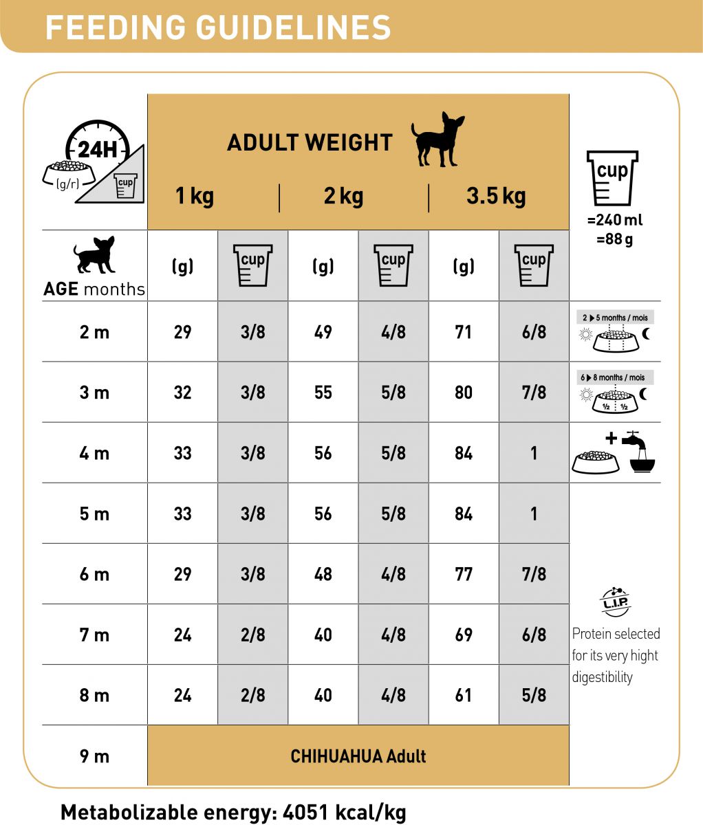 Giống chó Chihuahua khá kén ăn, chính vì vậy CHIHUAHUA PUPPY được nghiên cứu nhằm đáp ứng nhu cầu khẩu vị nhờ vào sự kết hợp của 3 yếu tố: kích thước và hình dáng hạt đặc biệt, công thức chế biến ưu việt và nguyên liệu cùng hương vị được lựa chọn cẩn thận.