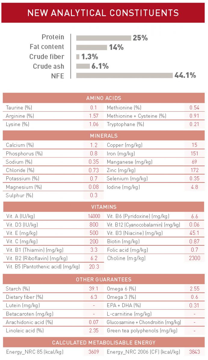 Bột mì, lúa mạch, bột gluten bắp, chất béo gà, ngô, gluten lúa mì, bột củ cải đường khô, lúa mì, hương vị tự nhiên, bột mì gạo, dầu cá, canxi cacbonat, men distillers khô men, natri silic aluminat, Dầu thực vật, kali phốt phát, muối, fructooligosaccharides, L-lysine, men thủy phân, clorua choline, taurine, DL-methionine, vitamin [DL-alpha tocopherol acetate (nguồn vitamin E), L-ascorbyl-2-polyphosphate Vitamin B6, vitamin B6, vitamin B6, vitamin B2, vitamin B2, vitamin B2, vitamin C, vitamin C, vitamin C, Kẽm proteinate, oxit kẽm, sắt sulfate, protein mangan, oxit mangan, đồng sulfat, canxi iodat, proteinate đồng, selenit natri), chiết xuất thảo mộc, bảo quản với tocopherols hỗn hợp và axit xitric.