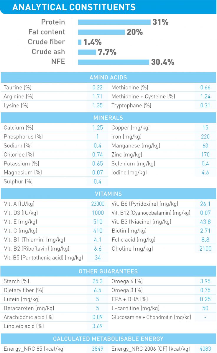 Protein gia cầm, gạo, chất béo động vật, protein thực vật*, bắp, củ cải đường, bột bắp, protein động vật, gluten bắp, khoáng chất, dầu cá, dầu đậu nành, fructo-oligo-sacarit (0,34%), men thủy phân (nguồn manno-oligo-sacarit), chiết xuất men (nguồn betaglucan), chiết xuất cúc vạn thọ (nguồn lutein).