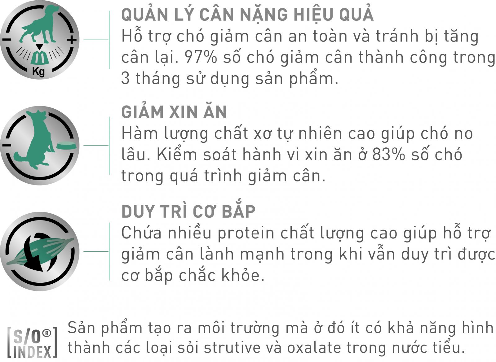 ROYAL CANIN Satiety là chế độ ăn hoàn chỉnh và cân bằng, hàm lượng xơ cao tạo cảm giác no lâu, giúp chú chó của bạn cảm thấy hài lòng sau mỗi bữa ăn từ đó giảm hành vi xin ăn. Những chú chó sẽ ăn ít lại nhưng vẫn duy trì được cơ bắp nhờ thành phần potein chất lượng cao, đồng thời bổ sung Glucosamine và Chondroitin hỗ trợ cho xương khớp chịu áp lực bởi cân nặng quá tải. Hợp chất chống oxy hóa được cấp bằng sáng chế hỗ trợ hệ miễn dịch tự nhiên.