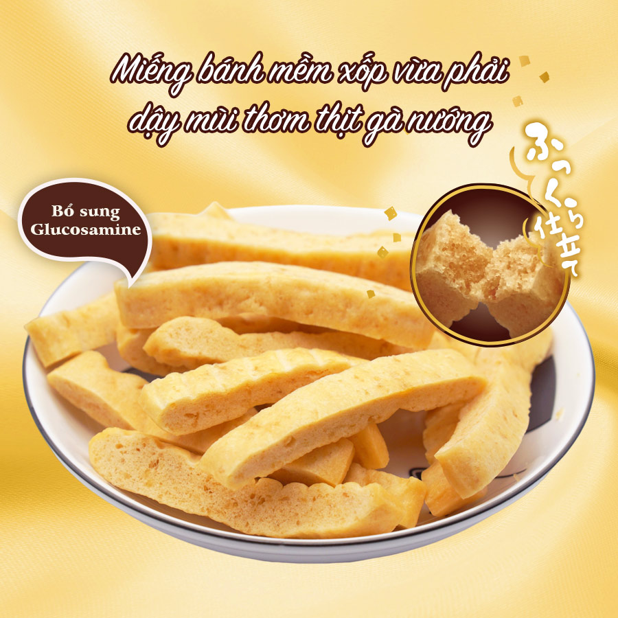 Bánh có kết cấu mềm xốp vừa phải, dễ ăn, lan tỏa hương thơm hấp dẫn của thịt gà nướng ngay khi mở gói. Ngoài hương vị thơm ngon, sản phẩm còn được bổ sung Glucosamine – dưỡng chất quan trọng giúp hỗ trợ xương khớp, đặc biệt phù hợp cho chó trưởng thành và chó lớn tuổi.