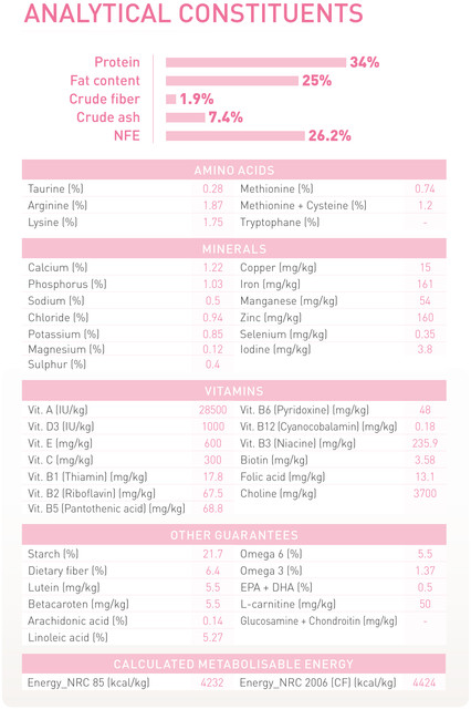 Bột đậu phụ của gà, cơm bia, chất béo gà, ngô, gluten lúa mì, hương vị tự nhiên, dầu cá, chưng cất ngũ cốc khô, bột củ cải đường khô, dầu thực vật, sợi pea, clorua kali, silic aluminat natri, natri pyrophosphat, fructooligosaccharides , Vitamin C, canxi clorua, canxi cacbonat, muối, L-lysine, vitamin [DL-alpha tocopherol acetate (nguồn vitamin E), L-ascorbyl-2-polyphosphate (nguồn vitamin C), niacin bổ sung, biotin, riboflavin bổ sung, D Canxi pantothenate, pyridoxine hydrochloride (vitamin B6), vitamin A acetate, vitamin đơn B1, bổ sung vitamin B12, axit folic, bổ sung vitamin D3], taurine, men thủy phân, DL-methionine, khoáng chất khoáng [zinc proteinate, mangan Proteinate, sulfur sắt, oxit kẽm, oxit mangan, đồng sunphat, canxi iodat, đồng proteinat, natri selenit], chiết xuất hoa oải hương (Tagetes erecta L.), magnesium oxide, chiết xuất từ hương thảo, bảo quản với tocopherols hỗn hợp và axit xitric.
