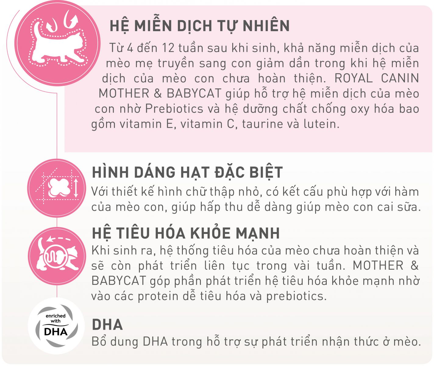 Khi sinh ra, hệ thống tiêu hóa của mèo chưa hoàn thiện và sẽ còn phát triển liên tục trong vài tuần. MOTHER & BABYCAT góp phần phát triển hệ tiêu hóa khỏe mạnh nhờ vào các protein dễ tiêu hóa và prebiotics.