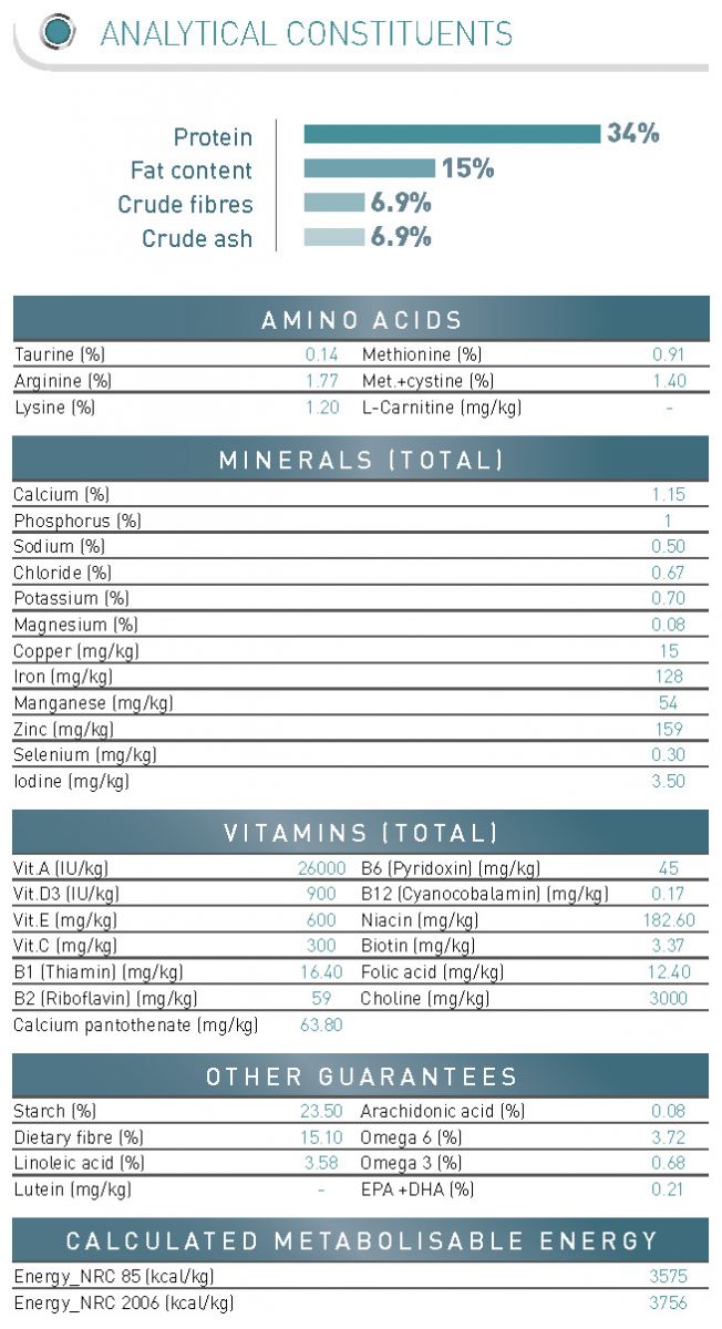Protein gia cầm, protein thực vật*, bắp, xơ thực vật, gạo, chất béo động vật, protein động vật, lúa mì, bột bắp, gluten bắp, củ cải đường, men, khoáng chất, dầu đậu nành, dầu cá, fructo-oligo-sacarit, psyllium (0,5%).
