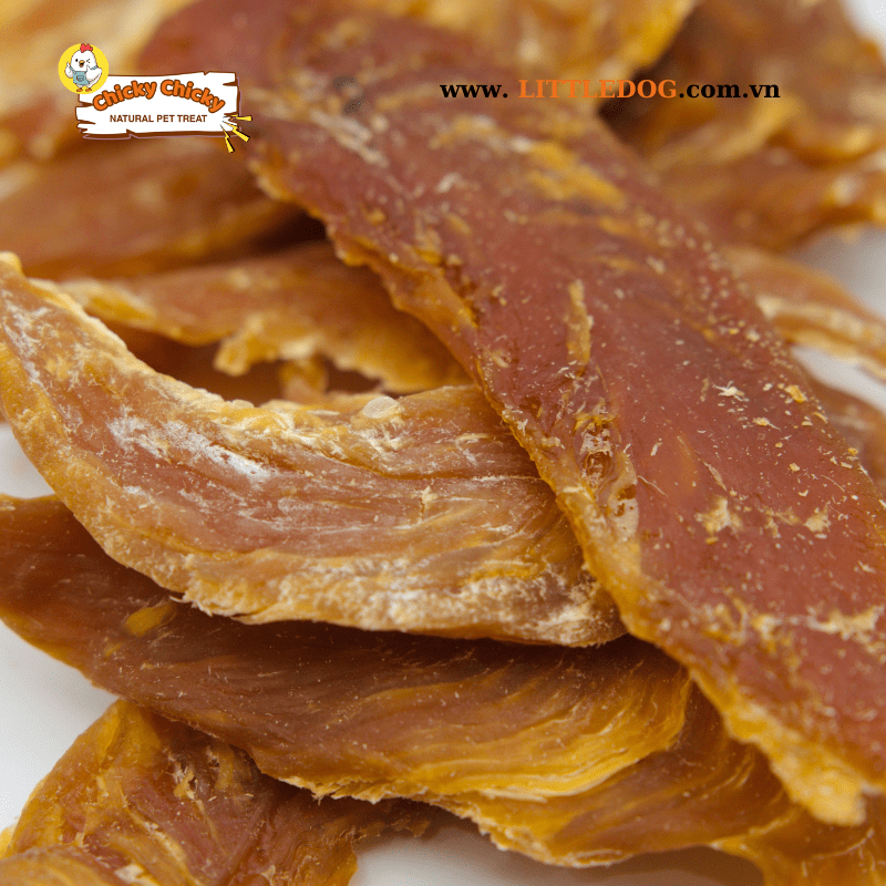 Thưởng cho thú cưng những miếng fillet gà dẻo mềm, thơm ngon tự nhiên từ thương hiệu Chicky Chicky! Sản phẩm được làm từ 100% ức gà tươi, thái lát mỏng và sấy chậm để giữ được độ mềm dẻo vừa phải, dễ xé, dễ nhai – phù hợp với cả chó và mèo ở mọi độ tuổi.